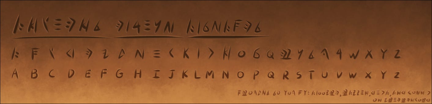 The solution settled on was to simply use stylized Latin characters, but perhaps one day we’ll have an official, completed alphabet to play around with as well.