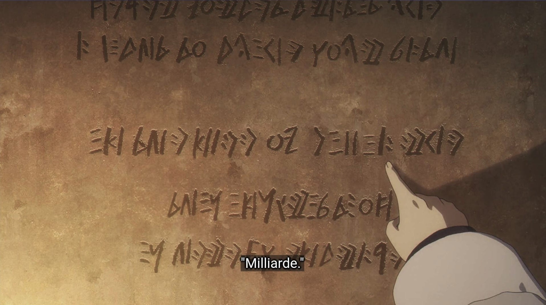 The name, “Milliarde,” in a specific context, with the word being pointed out by a character.